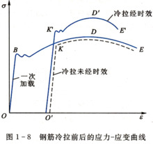 取一鋼筋對其施加拉應力冷拉,鋼筋會發生變形(并作應力——應變圖)。隨著拉應力增加,鋼筋內部承受的拉應力逐漸增大。當鋼筋內部產生的拉應力超過鋼筋具有的屈服點A,而達到C后,停止冷拉,卸去荷載。此時可以看到,鋼筋已產生塑性變形,在卸荷過程中,應力——應變圖有一個變化,直線O1C比直線OA要緩。